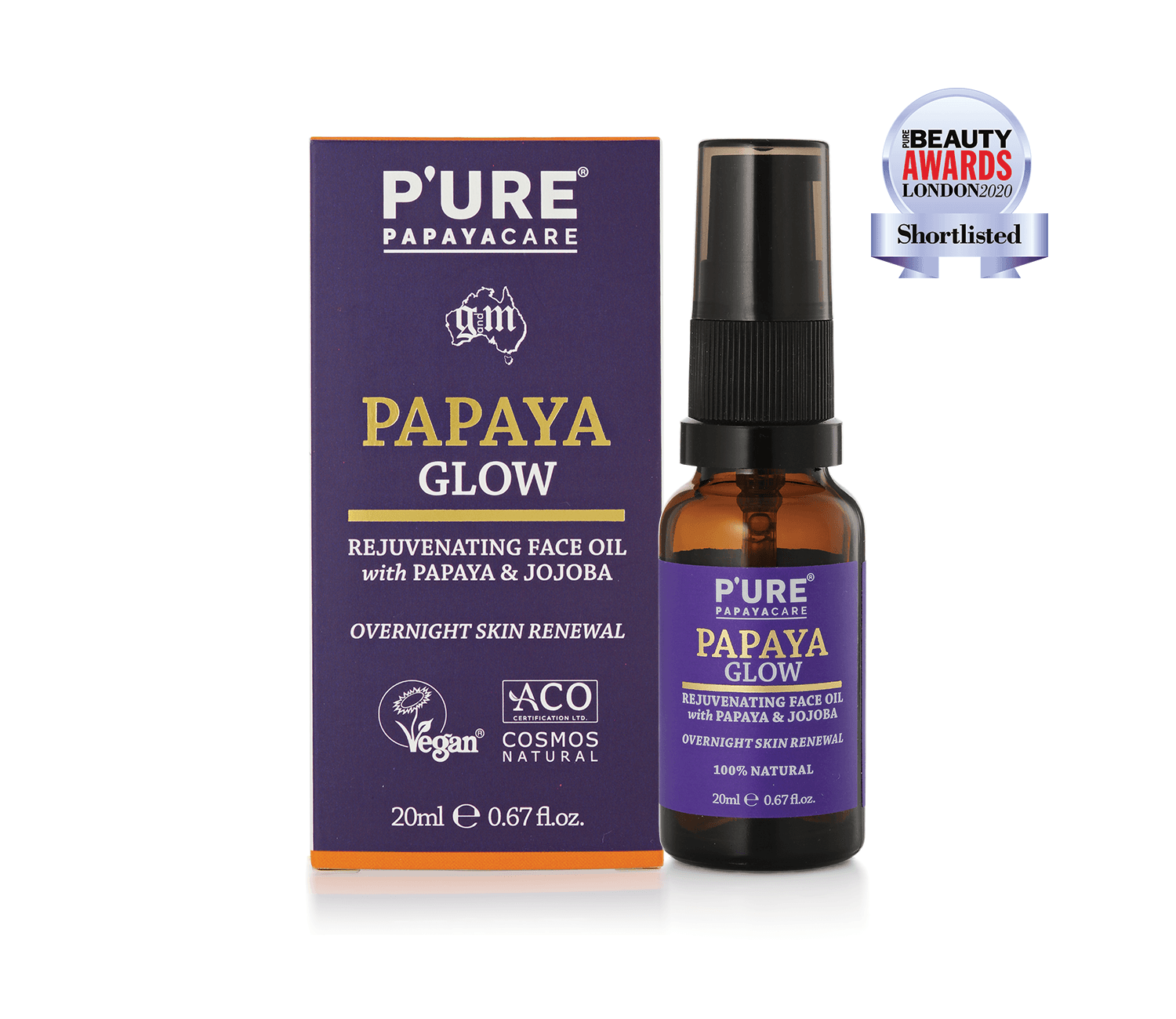 P’URE Papayacare Papaya Glow Rejuvenating Face Oil gently exfoliates & nourishes your skin while you sleep. Papaya Glow stimulates skin regeneration to help brighten complexion, restore & nourish skin with a unique combination of Papaya & Jojoba Oil.